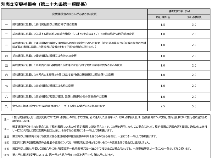 「お支払い対象旅行代金」に別表②右欄に記載する率を乗じて得た額の変更補償金を旅行終了日の翌日から起算して 30 日以内に