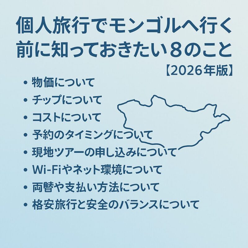 個人旅行でモンゴルへ行く前に知っておきたい8のこと【2026年版】個人旅行でモンゴルを訪れる前に知っておきたい物価、チップ、コスト、予約のタイミング、現地ツアー、Wi-Fi、両替、安全対策をQ&A形式で解説。2026年版として最新...