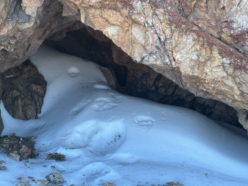 ガイドに案内されながら残雪の中を進むと、ついに見つけました……マヌルネコの足跡!